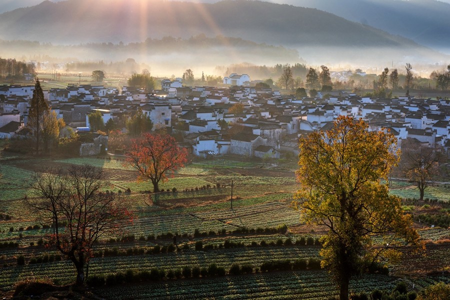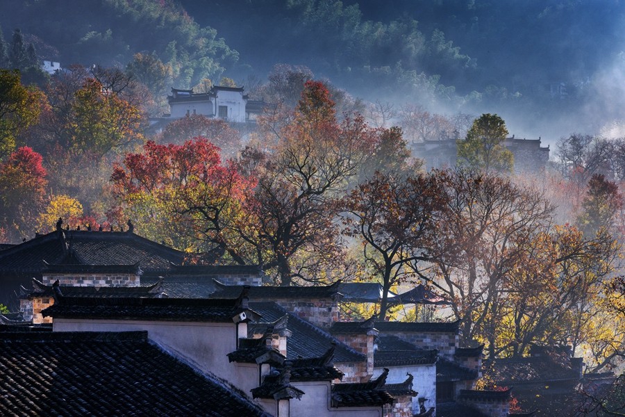 早晨拍摄群山环抱,云雾缭绕的石城晨曦,当一缕缕阳光从山脊洒向晨雾中,晨雾中呈现如流金般的美丽,千年古枫林、徽派民居、袅袅炊烟、交相辉映。在晨曦中恍若人间仙境、世外桃源。早餐后在村里自由创作,中餐后边走边拍,主要拍摄中国最圆的水畔古村落:菊径(镜头赿广赿好),再拍网站布置的农民在小瓦房上劳作等场景,边走边拍田园秋色,后赴晓起,晚餐后进行摄影讲座。 (宿:晓起)