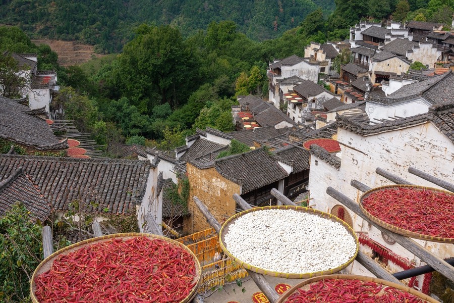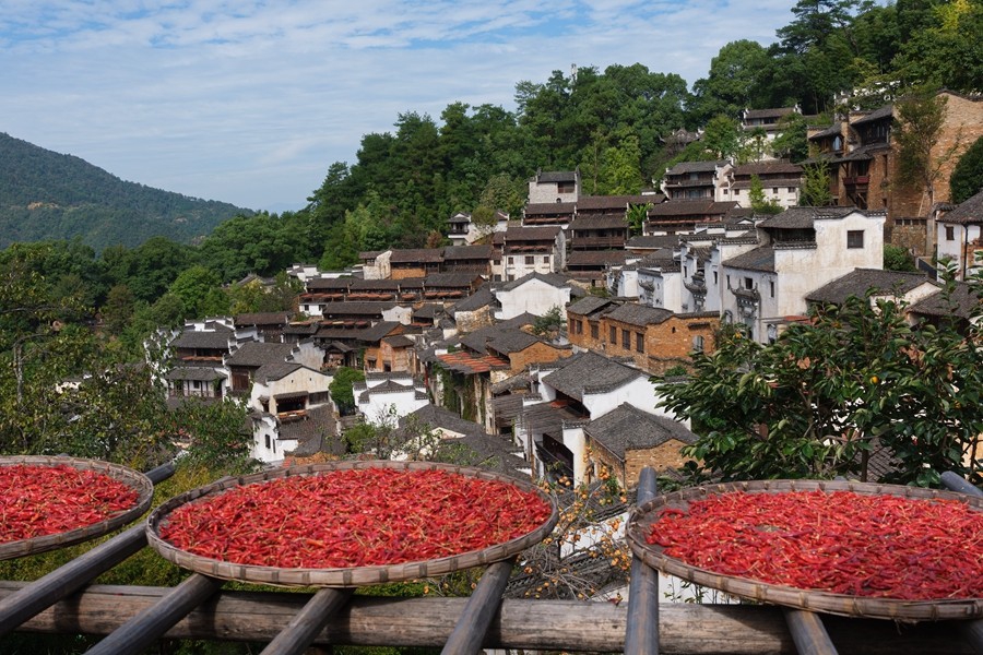 早晨我们赴篁岭创作,篁岭古村数百栋徽派古民居在百米落差的坡面错落有序排布,每当日出山头,晨曦映照,整个山间村落饱经沧桑的徽式民居土砖外墙与晒架上,圆圆晒匾里铺满了火红的辣椒和金黄色的稻谷,缤纷的丰收果实组合,绘就出世界独一无二的“晒秋”农俗景观、最美的乡村符号。