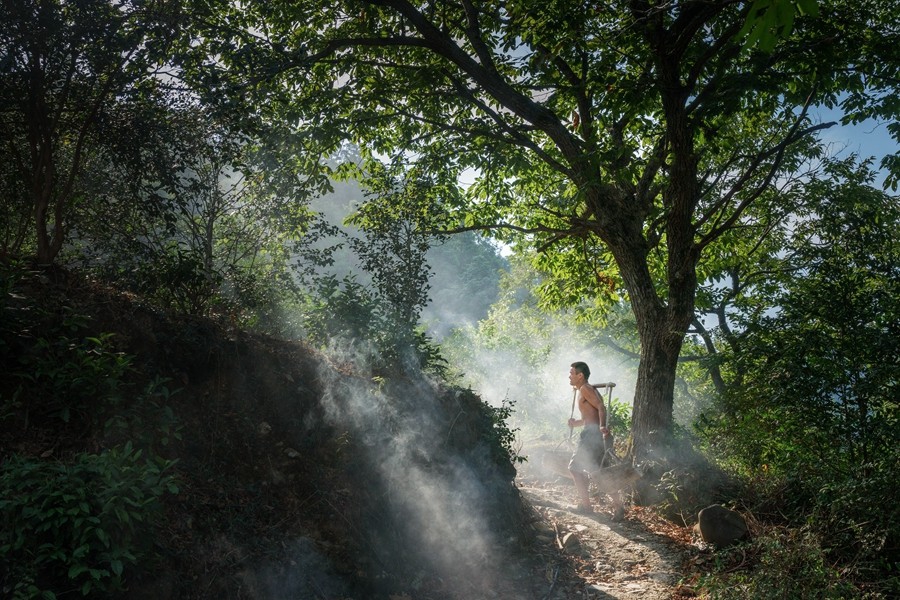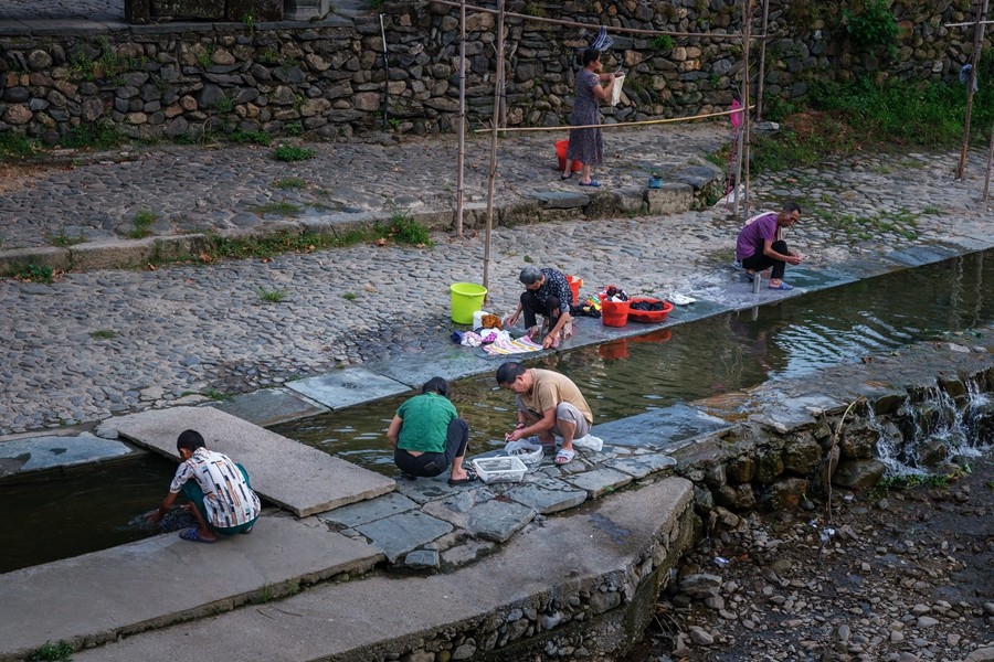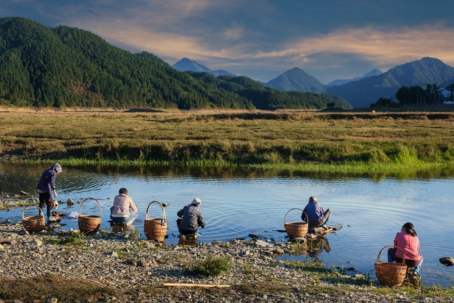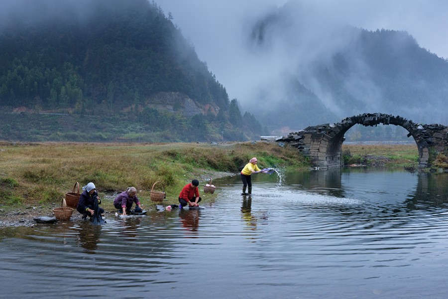 早晨我们去拍一个特定的场景,也是非物质文化遗产,拍完特定场景以后我们回古镇进行创作。古镇河边浣洗的村妇,端着老粗碗饭的大爷,挑着担子出去或归来,走在木板桥上的劳作人,青山绿水的古村落,都是我们创作的题材。